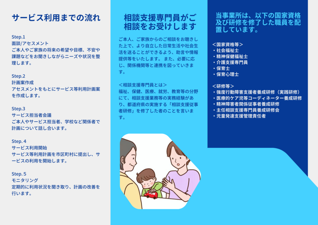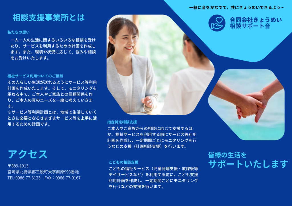 当社は「相談サポート音(相談支援事業)」と「多機能型事業所かなで(児童発達支援・放課後等デイサービス・保育所等訪問支援)」を運営し、あわせて「末永ソーシャルワークオフィス」を併設しながら、地域に根ざした支援に取り組んでいます。